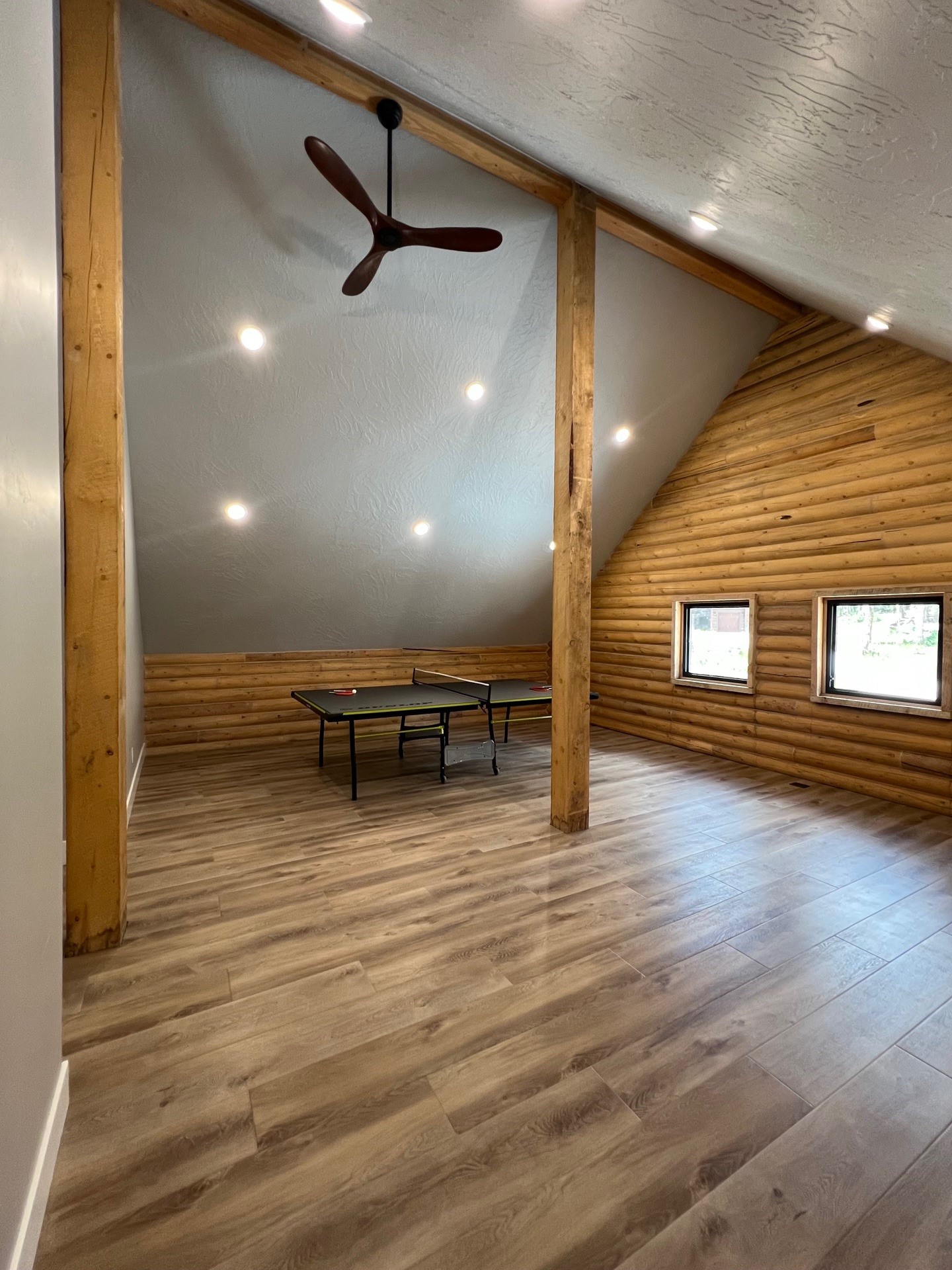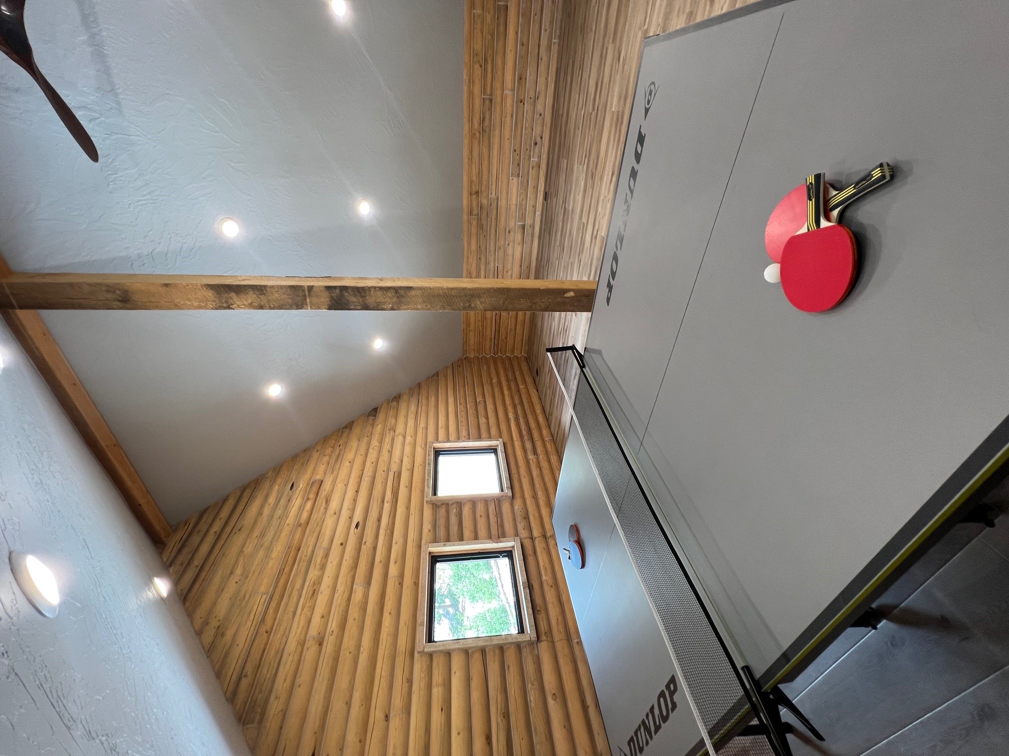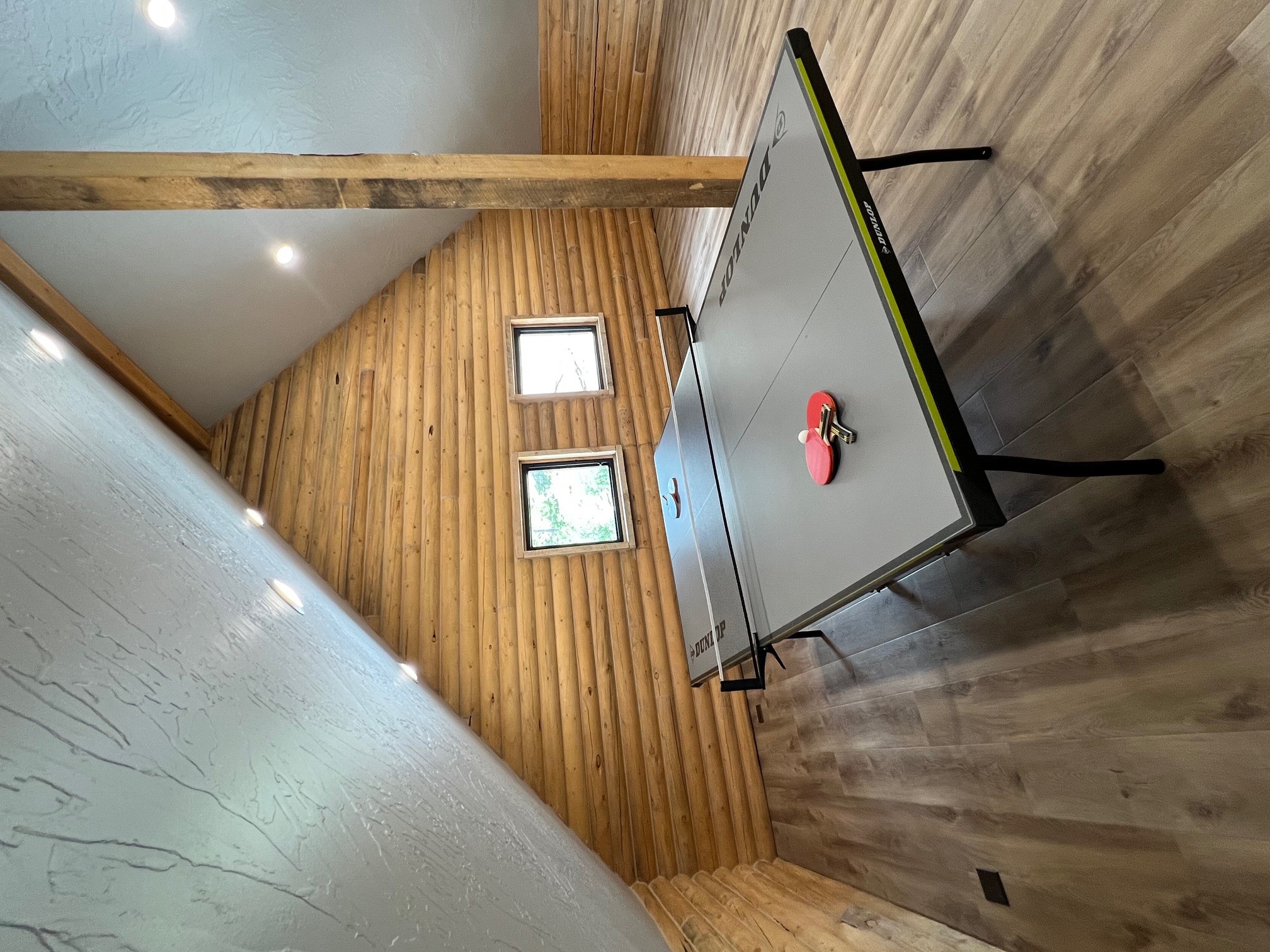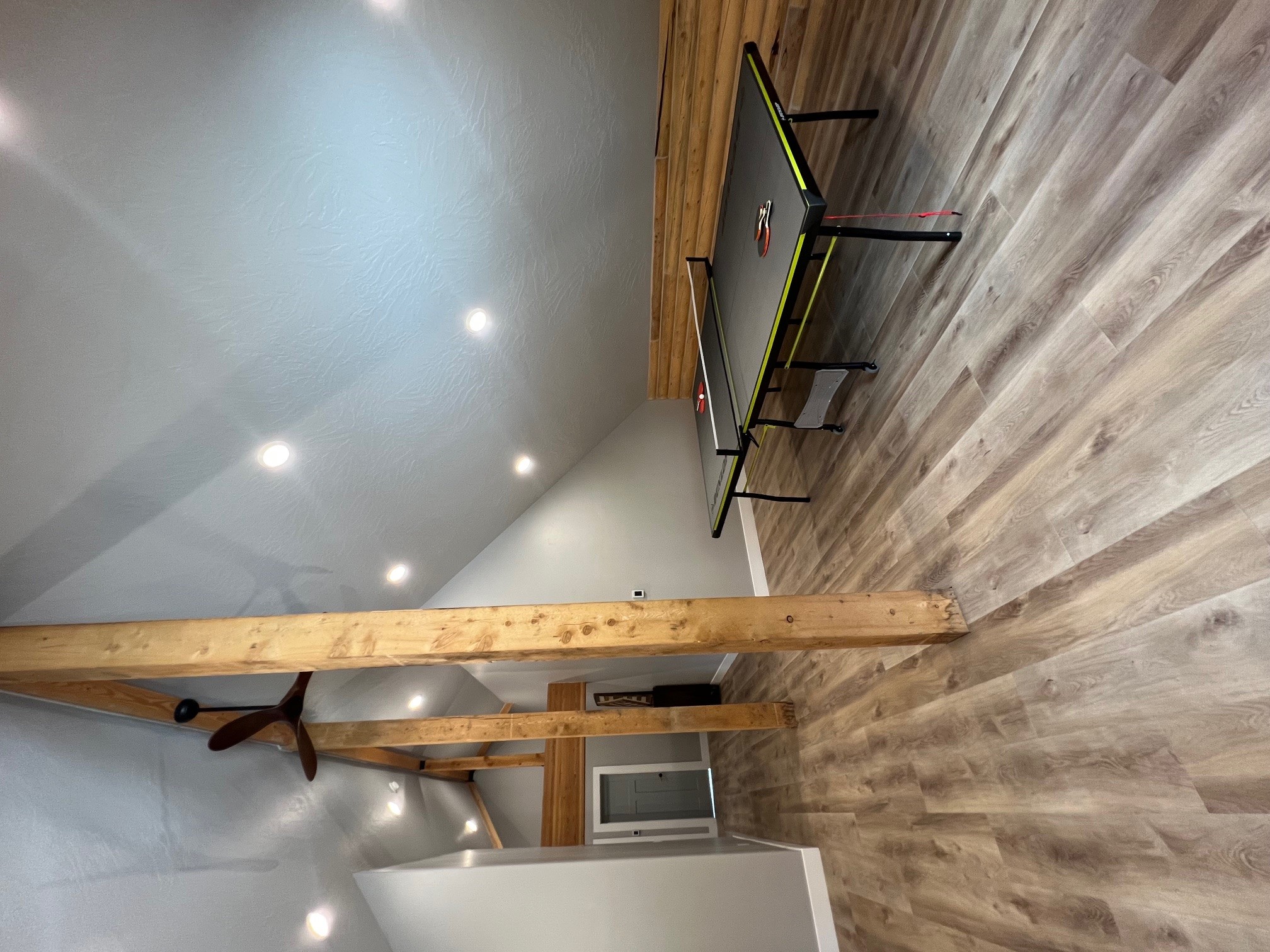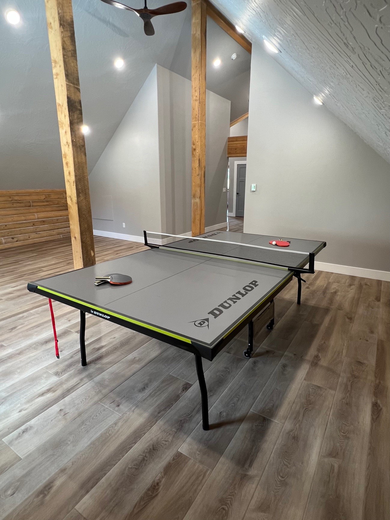 Bright, cozy, and built for groups. Two suites, a bedroom with two Queen beds, and a massive bunk room that sleeps eleven. After the mountain, unwind by the main floor fireplace or go big in the media room with a 98" TV and electric fireplace. There’s also a dedicated ping pong table hangout room and a game table alcove.